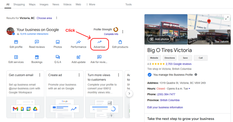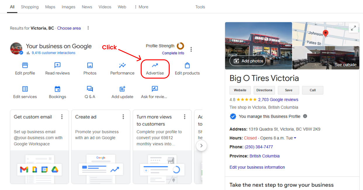 - Once you’re on your Google My Business dashboard, locate the “Advertise” option and click on it.