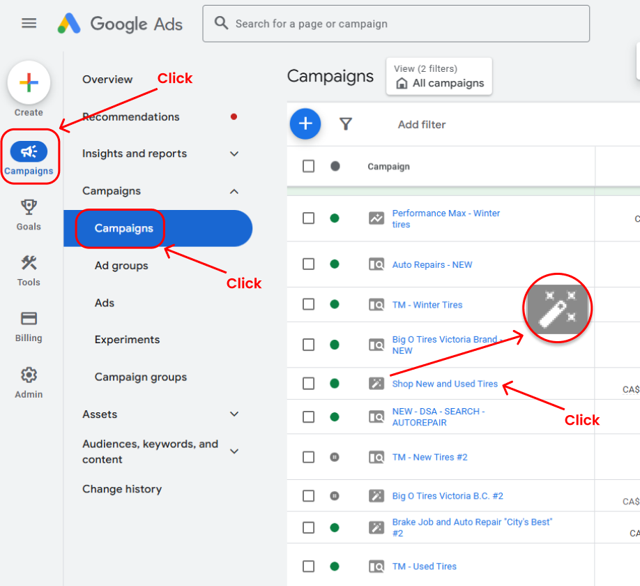 - Look for the campaigns marked with the magic pencil icon, as these indicate Smart Campaigns.