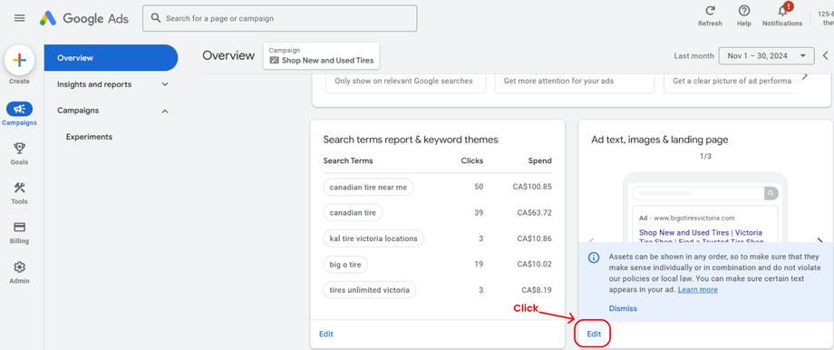 - In the section labeled “Ad Text, Images & Landing Page,” click the “Edit” button.